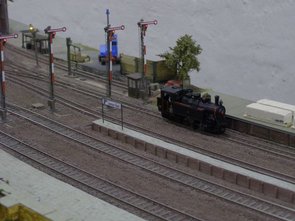 Der Bahnhof hat einen Bw für H0-e Loks und Umschlagsgebaude zwischen H0 und H0-e. Die Wagen können von hier auf H0-e Rollwagen weiter fahren.